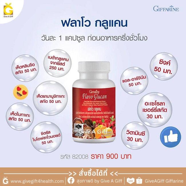 แต่ถ้าไม่มีเวลาในการเลือกสรรรับประทานอาหารที่มีประโยชน์ต่อระบบภูมิคุ้มกัน ฟลาโว กลูแคน จากกิฟฟารีน สามารถช่วยคุณได้ ด้วยส่วนผสมของฟลาโว กลูแคน ที่มีทั้งเบต้ากลูแคนจากยีสต์ สารสกัดจากเห็ด 3 ชนิด คือ เห็ดหลินจือ “ยาอายุวัฒนะ” ที่มีประโยชน์ต่อผู้ที่เป็นหอบหืด และภูมิแพ้ เห็ดยามาบูชิทาเกะ และเห็ดไมทาเกะ วิตามินซี ซิตรัสไบโอฟลาโวนอยด์ อะเซโรลาเชอร์รีสกัด สังกะสี และแอล-อาร์จินีน ล้วนแล้วแต่มีประโยชน์ต่อการเพิ่มประสิทธิภาพการทำงานของระบบภูมิคุ้มกัน ให้ร่างกายของเราต้านทานกับเชื้อโรคต่าง ๆ ได้ดีขึ้นทั้งนั้น