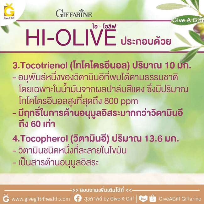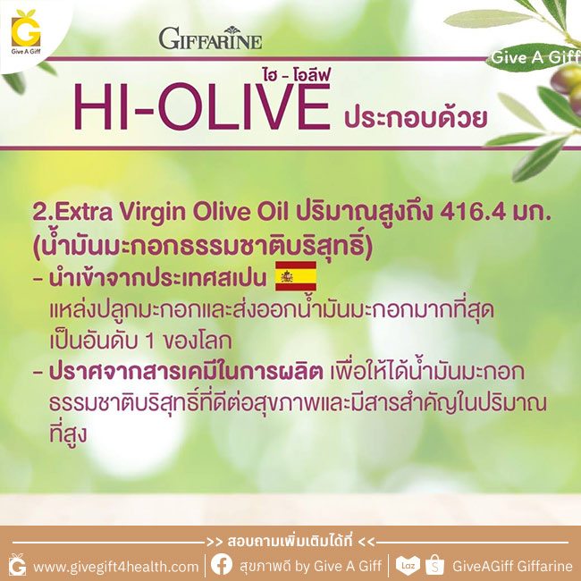 กิฟฟารีน ไฮ-โอลีฟ เราได้นำน้ำมันมะกอกบริสุทธิ์พิเศษ (Extra Virgin Olive Oil) ที่ผ่านกระบวนการผลิตแบบ 9 ขั้นตอน มาเป็นส่วนประกอบหลัก ซึ่งให้กรดไขมันโอเมก้า 9 และสาร Hydroxytyrosol สูง และยังเติมสารสกัดที่ได้จากน้ำของการบีบผลมะกอก ซึ่งให้สาร Hydroxytyrosol สูงกว่าที่สกัดได้จากน้ำมันมะกอกเข้ามาเพิ่มประสิทธิภาพการต้านอนุมูลอิสระ ดูแลผิวพรรณ และชะลอวัยให้มากกว่าเดิม นอกจากนี้ยังมีวิตามินอีธรรมชาติ ที่สกัดได้จากถั่วเหลือง และไทโคไตรอีนอล ที่สกัดได้จากผลปาล์มแดง มาเพิ่มประสิทธิภาพการดูแลสุขภาพให้มากขึ้นกว่าเดิมอีกด้วย