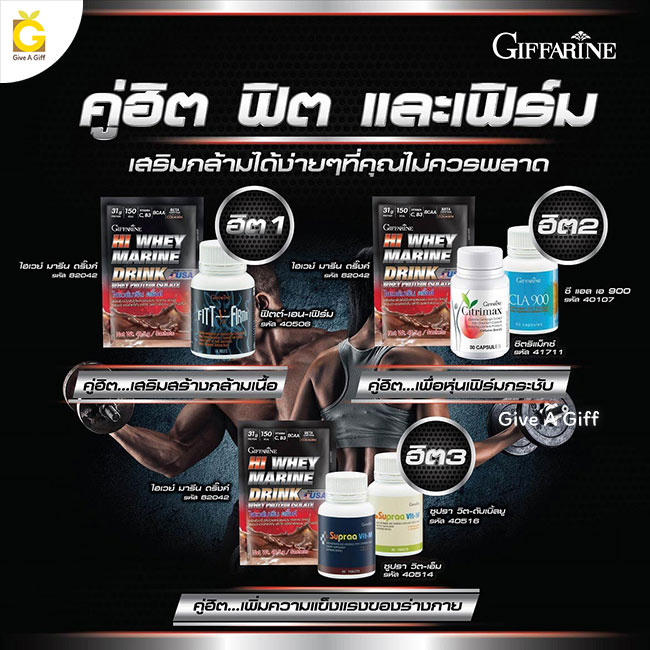กิฟฟารีน ฟิตต์-เอน-เฟิร์ม (Giffarine Fitt-N-Firmm) ผลิตภัณฑ์เสริมอาหาร ครีเอทีน โมโนไฮเดรต ผสมบรานซ์-เชน อะมิโน แอซิด เวย์โปรตีนเข้มข้น แอล-คาร์นิทีน คอลลาเจน มะเขือเทศผง และสารสกัดจากเมล็ดองุ่น ชนิดเม็ด