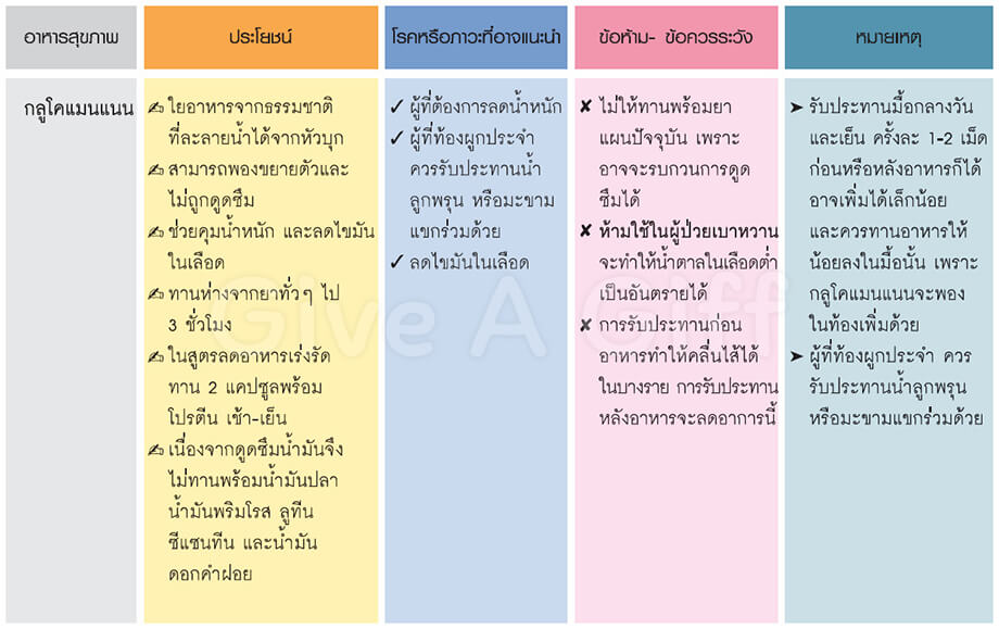 กลูโคแมนแนน เป็นเส้นใยอาหารที่สกัดมาจากหัวบุก สามารถละลายน้ำ และขยายตัวได้มากถึง 150 – 200 เท่า มีความคงตัวสูง ไม่ทำปฏิกิริยากับกรด ด่าง หรือน้ำย่อยในร่างกาย จึงไม่ถูกย่อยสลายให้พลังงาน และไม่สามารถดูดซึมเข้าร่างกายได้ เมื่อขยายตัวจะมีลักษณะเป็นวุ้นนิ่ม ๆ คงปริมาตร ไม่ถูกดูดซึมน้ำกลับ และไม่มีแกนที่เป็นของแข็ง จึงไม่เกาะติดเยื่อผนังทางเดินอาหาร กลูโคแมนแนนจะไปพองตัวแทนที่อาหาร ทำให้เรารับประทานอาหารได้น้อยลงนั่นเอง ประโยชน์ของกลูโคแมนแนน