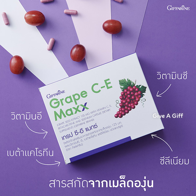 กิฟฟารีน เกรป ซี-อี แมกซ์ (Giffarine Grape C-E Maxx) ผลิตภัณฑ์เสริมอาหาร สารสกัดจากเมล็ดองุ่น 125 มก. ผสมวิตามินซี วิตามินอี เบต้าแคโรทีน และซีลีเนียม ชนิดแคปซูล