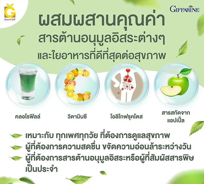 คลอโรฟิลล์ ผสมวิตามินซี โอลิโกฟรุคโตส และสารสกัดจากแอปเปิ้ล
