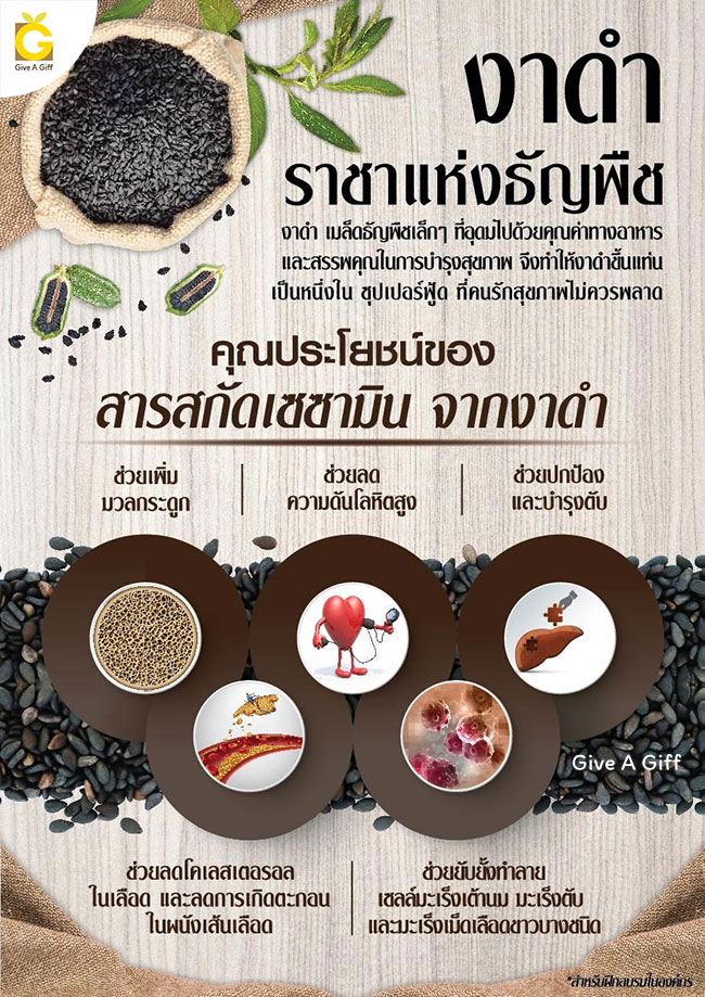 สารสกัดจากงาดำมีประโยชน์ต่อสุขภาพของเรา ดังนี้ – ช่วยเพิ่มมวลกระดูก ป้องกันกระดูกพรุน – ป้องกันข้อเสื่อมและข้ออักเสบ – มีฤทธิ์ต่อต้านอนุมูลอิสระ และต้านการอักเสบ – ช่วยปกป้องและบำรุงตับ รวมถึงการลดการสร้างโคเลสเตอรอลที่ตับ – ช่วยลดความดันโลหิต – ช่วยลดระดับโคเลสเตอรอล และลดการเกิดตะกอนในผนังเส้นเลือด – ลดความเสี่ยงโรคหัวใจ – ช่วยยับยั้งทำลายเซลล์มะเร็งเต้านม, มะเร็งตับ, มะเร็งเม็ดเลือดขาวบางชนิด