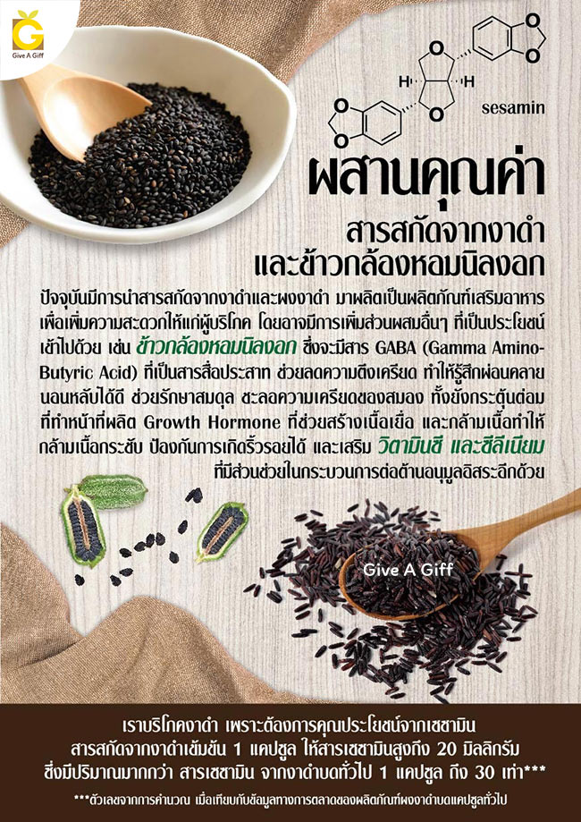 ส่วนประกอบที่สำคัญโดยประมาณใน 1 แคปซูล สารสกัดจากงาดำ 200 มก. ข้าวกล้องหอมนิลงอกบด 165 มก. งาดำบด 50 มก. แคลเซียม แอสคอร์เบต 18.715 มก. (ให้วิตามินซี 15 มก.) ซีลีเนียม อะมิโนแอซิดคีเลต 1% 1.75 มก. (ให้ซีลีเนียม 17.5 มคก.)