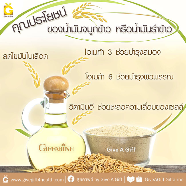นํ้ามันจมูกข้าวและนํ้ามันรำข้าว น้ำมันจากธรรมชาติ ที่ผ่านการคัดสรรคุณภาพข้าวมาเป็นอย่างดี นำมาสกัดด้วยกรรมวิธีต่าง ๆ จนออกมาเป็นน้ำมันเพื่อการดูแลสุขภาพ และมีประโยชน์มากมายต่อร่างกาย ดังนี้ ✔️ ช่วยบำรุงสมอง ✔️ บำรุงผิวพรรณ ✔️ เพิ่มปริมาณไขมันดีให้กับร่างกาย (HDL-Cholesterol) ✔️ ต้านอนุมูลอิสระ ✔️ ชะลอวัย ✔️ ลดไขมันในเส้นเลือด ทั้งไขมันโคเลสเตอรอล และแอลดีแอล-โคเลสเตอรอล (LDL-Cholesterol)