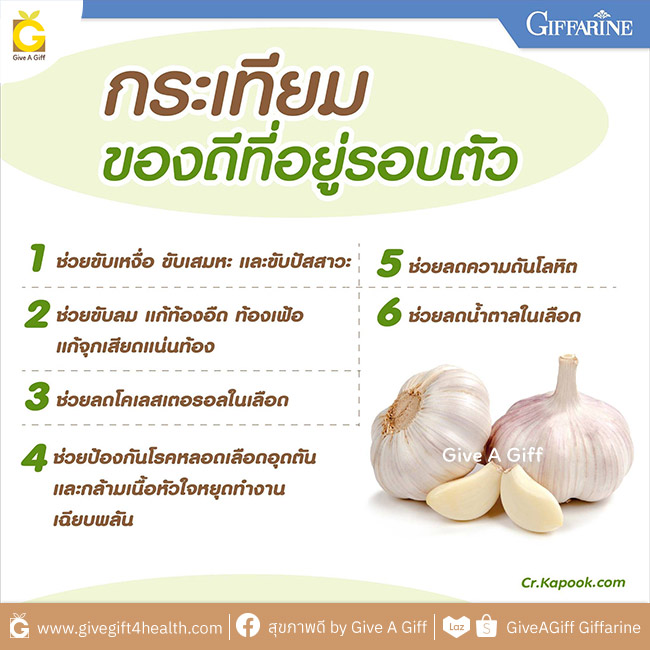 กระเทียม เป็นพืชสมุนไพรที่มากด้วยคุณค่าและประโยนช์ต่อสุขภาพ นอกจากจะนำมาปรุงอาหารเพื่อเพิ่มรสชาติ และความหอมให้กับอาหารแล้ว กระเทียมยังสามารถป้องกันโรคได้หลายชนิด ดังนี้ 1. มีฤทธิ์เสริมภูมิต้านทาน โดยสารอัลลิซิน (allicin) และซัลไฟด์ (sulfides) ในกระเทียมเพิ่มประสิทธิภาพการทำงานของเซลล์ในระบบภูมิคุ้มกัน มีฤทธิ์ฆ่าเชื้อโรค อีกทั้งยังเป็นสารต้านอนุมูลอิสระด้วย 2. ช่วยลดปริมาณไขมันในเส้นเลือดทั้งคอเลสเตอรอลและไตรกรีเซอไรด์ 3. ป้องกันอาการเส้นเลือดอุดตัน และความดันโลหิตสูง 4. ลดอัตราการเสี่ยงของการเกิดโรคหัวใจ 5. ลดระดับน้ำตาลในเลือด 6. ช่วยขับลม บรรเทาอาการท้องอืด ท้องเฟ้อ จุกเสียด แน่นท้อง กระตุ้นน้ำย่อยทำให้เจริญอาหาร 7. สามารถยับยั้งและทำลายเชื้อมะเร็งได้หลายชนิด เช่น มะเร็งเต้านม มะเร็งปอด มะเร็งกระเพาะอาหาร มะเร็งต่อมลูกหมาก เป็นต้น