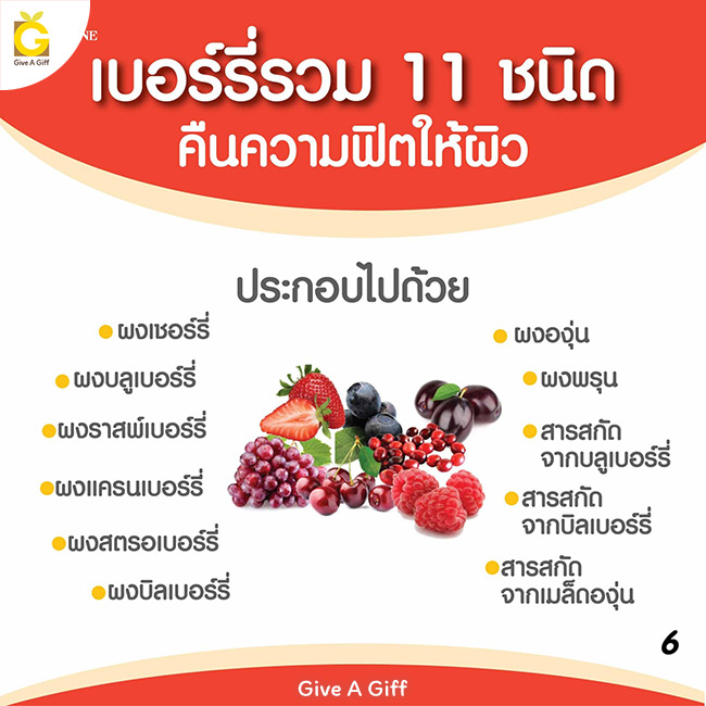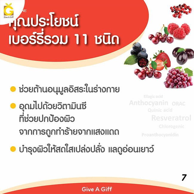 เบอร์รีรวม 11 ชนิด ได้แก่ สารสกัดจากเมล็ดองุ่น สารสกัดบลูเบอร์รี สารสกัดบิลเบอร์รี ผงองุ่น ผงบลูเบอร์รี ผงบิลเบอร์รี ผงพรุน ผงเชอร์รี่ ผงราสพ์เบอร์รี ผงแครนเบอร์รี และผงสตรอว์เบอร์รี จากประเทศอเมริกา ที่อุดมไปด้วยสารต้านอนุมูลอิสระ ทั้งสารประกอบฟีนอลิก แอนโธไซยานินส์ วิตามิน และไฟเบอร์ - ช่วยลดความเสี่ยงของการเกิดโรคหลอดเลือดหัวใจ - ลดไขมันในเลือด - ลดระดับน้ำตาลในเลือด - ลดความเสี่ยงของการเป็นโรคมะเร็งได้