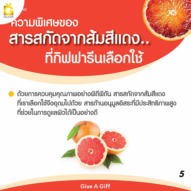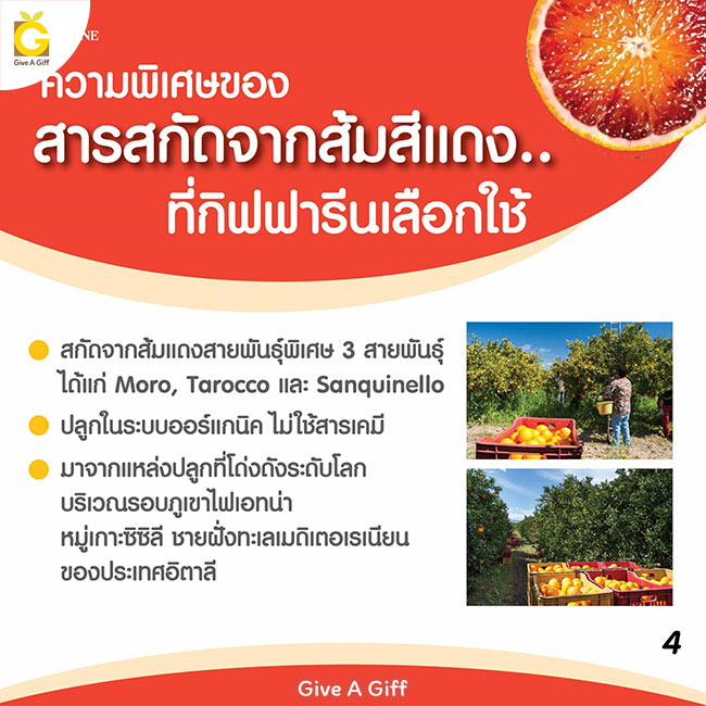 กิฟฟารีน เรด ออเรนจ์ คอมเพล็กซ์ 12 ผลิตภัณฑ์จากสารสกัดส้มสีแดง 3 สายพันธ์ุ เมื่อผสานคุณค่าจากสารสกัดจากเบอร์รีรวม 11 ชนิด จึงอุดมไปด้วยสารต้านอนุมูลอิสระที่ช่วยดูแลสุขภาพร่างกายของเรา ปกป้องผิวของเราจากการแสงแดด และดูแลผิวให้สวย ใส ห่างไกลจุดด่างดำอีกด้วย