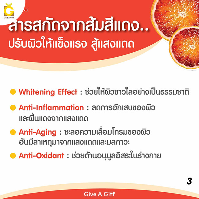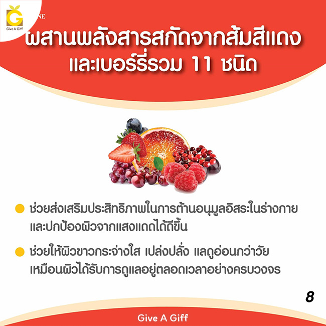 "หมดกังวลปัญหาผิวที่กวนใจ เผยผิวขาว เนียนใส อย่างมีออร่า" ด้วยคุณค่าของสารสกัดจากส้มสีแดง และเบอร์รีรวม 11 ชนิด ส่วนผสมอันล้ำค่า หัวใจสำคัญของการดูแลผิวจากภายในสู่ภายนอก 🌟